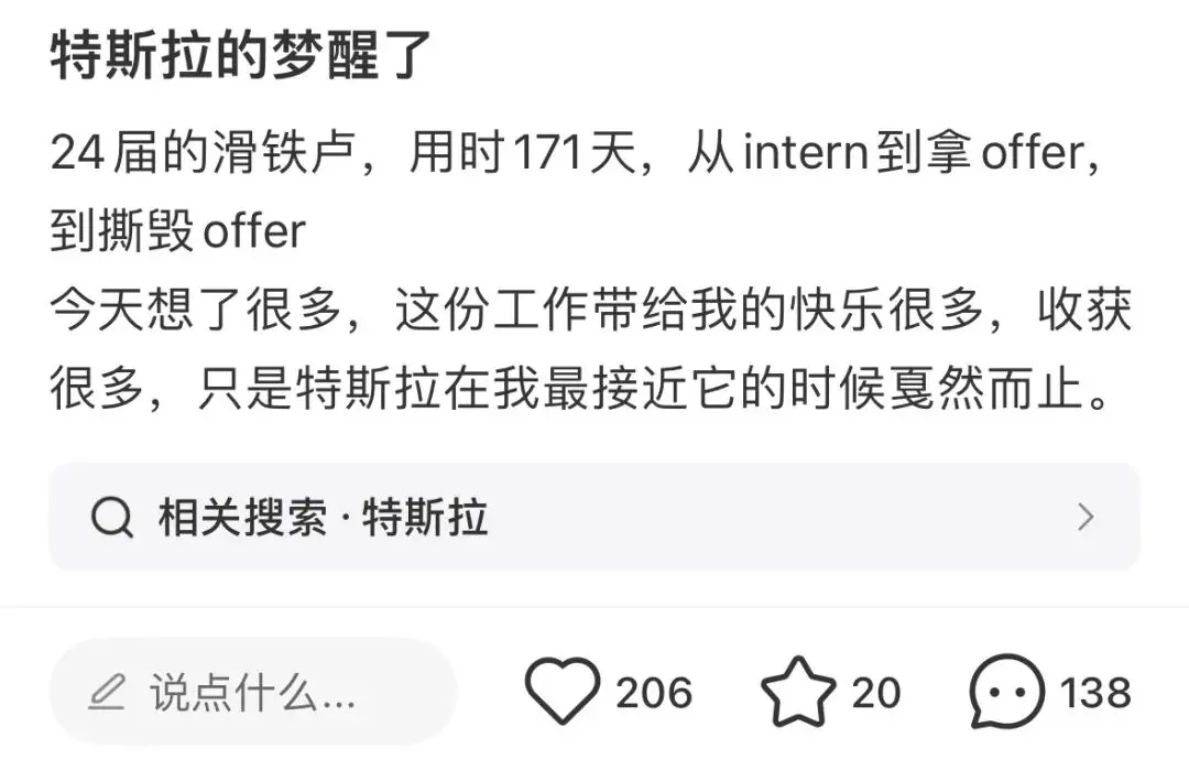还没就业先被“裁”,这样的事情魔幻的发生在了2024应届生身上。在4月末,网络中传出特斯拉收回应届生offer的消息,相关词条还登上社交平台热搜榜。虽然特斯拉针对此事还没有回应,但在小红书等社交媒体上,**有不少应届生透露,大规模取消offer的情况确实存在。