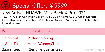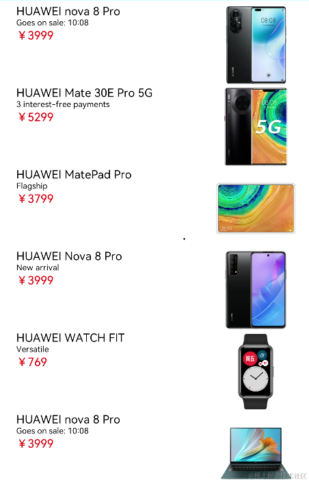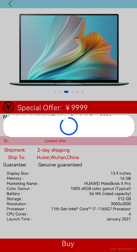 @Component struct DetailText { build() { Column() { Row() { Image($r('app.media.icon_promotion')) .objectFit(ImageFit.Contain) .height(30) .width(30) .margin({ left: 10 }) Text('Special Offer: ¥9999') .fontColor(Color.White) .fontSize(20) .margin({ left: 10 }) } .width('100%') .height(35) .backgroundColor(Color.Red) Column() { Text('New Arrival: HUAWEI MateBook X Pro 2021') .fontSize(18) .margin({ left: 10 }) .alignSelf(ItemAlign.Start) Text('13.9-Inch, 11th Gen Intel® Core™ i7, 16 GB of Memory, 512 GB of Storage, Ultra-slim Business Laptop, 3K FullView Display, Multi-screen Collaboration, Emerald Green') .fontSize(14) .margin({ left: 10 }) Row() { Image($r('app.media.icon_buy')) .objectFit(ImageFit.Contain) .height(30) .width(30) .margin({ left: 10 }) Text('Limited offer') .fontSize(15) .fontColor(Color.Red) .margin({ left: 100 }) } .backgroundColor(Color.Pink) .width('100%') .height(45) .margin({ top: 10 }) Text(' Shipment: 2-day shipping') .fontSize(13) .fontColor(Color.Red) .margin({ left: 10, top: 5 }) .alignSelf(ItemAlign.Start) Text(' Ship To: Hubei,Wuhan,China') .fontSize(13) .fontColor(Color.Red) .margin({ left: 10, top: 5 }) .alignSelf(ItemAlign.Start) .onClick(() => { prompt.showDialog({ title: 'select address', }) }) Text('Guarantee: Genuine guaranteed') .fontSize(13) .margin({ left: 10, top: 5 }) .alignSelf(ItemAlign.Start) } .height(170) .width('100%') } .height(180) .width('100%') } }DetailArsList组件效果图如下: