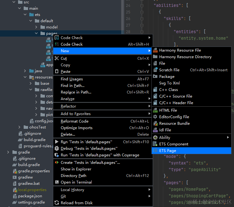 在pages目录下面新建一个ETS Page 命名为MyPage.ets,在config.json文件pages属性中也会自动添加“pages/MyPage”页面路由。