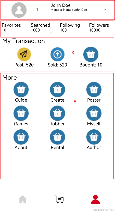 从上面效果图可以看出,主界面我的页签主要由下面四部分组成: