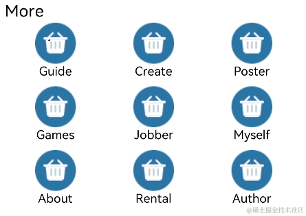 @Component struct MyTransList { private imageItems: ImageItem[] = getTrans() build() { Column() { Text('My Transaction') .fontSize(20) .margin({ left: 10 }) .width('100%') .height(30) Row() { List() { ForEach(this.imageItems, item => { ListItem() { DataItem({ imageItem: item }) } }, item => item.id.toString()) } .height(70) .width('100%') .edgeEffect(EdgeEffect.None) .margin({ top: 5 }) .padding({ left: 16, right: 16 }) .listDirection(Axis.Horizontal) } } .height(120) } }MoreGrid组件效果图如下:
