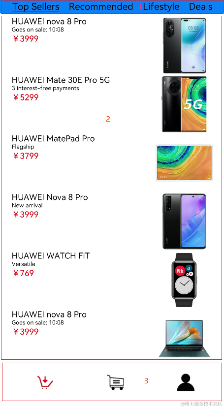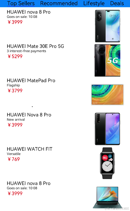 @Component @Component struct GoodsHome { private goodsItems: GoodsData[] build() { Column() { Tabs() { TabContent() { GoodsList({ goodsItems: this.goodsItems }); } .tabBar("Top Sellers") .backgroundColor(Color.White) TabContent() { GoodsList({ goodsItems: this.goodsItems }); } .tabBar("Recommended") .backgroundColor(Color.White) TabContent() { GoodsList({ goodsItems: this.goodsItems }); } .tabBar("Lifestyle") .backgroundColor(Color.White) TabContent() { GoodsList({ goodsItems: this.goodsItems }); } .tabBar("Deals") .backgroundColor(Color.White) } .barWidth(540) .barHeight(50) .scrollable(true) .barMode(BarMode.Scrollable) .backgroundColor('#007DFF') .height('100%') } .alignItems(HorizontalAlign.Start) } }在GoodsHome中使用Tabs组件,在Tabs组件中设置4个TabContent,给每个TabContent设置tabBar属性,并设置TabContent容器中的内容GoodsList组件,GoodsList组件效果图如下: