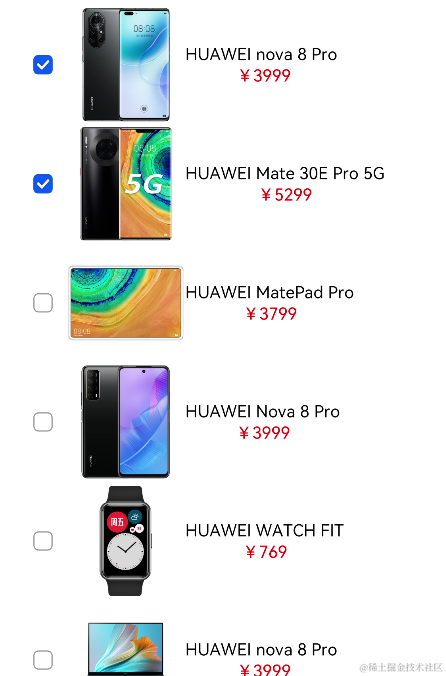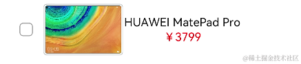 @Component struct ShopCartList { private goodsItems: GoodsData[] build() { Column() { List() { ForEach(this.goodsItems, item => { ListItem() { ShopCartListItem({ goodsItem: item }) } }, item => item.id.toString()) } .height('100%') .width('100%') .align(Alignment.Top) .margin({ top: 5 }) } .height('90%') } }在ShopCartListItem中使用Toggle的单选框类型来实现每个item的选择和取消选择,在Toggle的onChage事件中来改变totalPrice的数值。ShopCartListItem组件效果图如下: