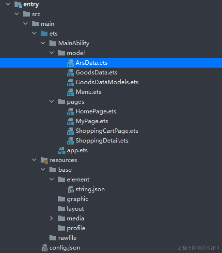 新建与pages文件夹同级的model文件夹,并在model目录下新建ArsData.ets、GoodsData.ets、Menu.ets和GoodsDataModels.ets文件,其中ArsData.ets、GoodsData.ets、Menu.ets是数据实体类,GoodsDataModels.ets是存放这三种实体数据集合,并定义了获取各种数据集合的方法。数据实体包含实体的属性和构造方法,可通过new ArsData(string,string) 来获取ArsData对象,ArsData.ets内容如下: