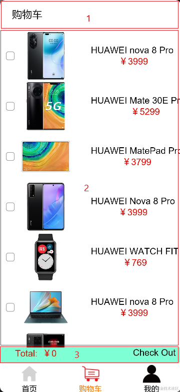 在本任务中我们主要是构建一个购物车页签,给商品列表的每个商品设置一个单选框,可以选中与取消选中,底部Total值也会随之增加或减少,点击Check Out时会触发弹窗。下面我们来完成ShoppingCart页签。