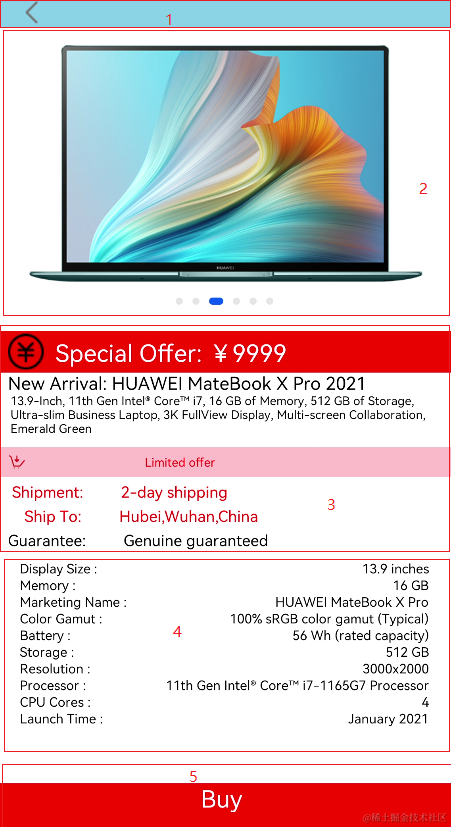 从上面效果图可以看出,商品详情页面主要由下面五部分组成: