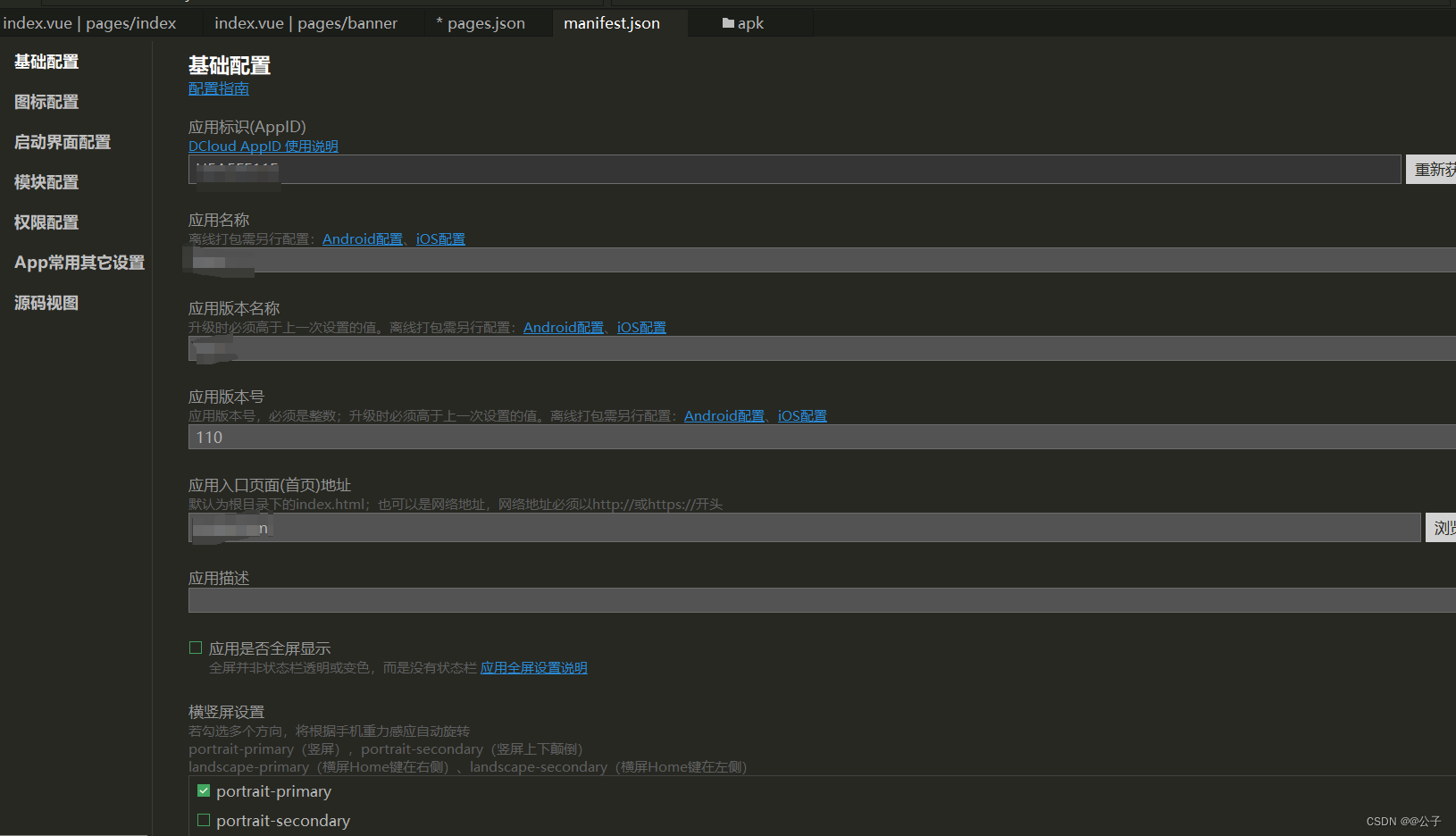 点击 manifest.json 文件,这里我们可以配置应用标识、应用名称、图标,权限配置等等,可以按自己的需求来一一配置