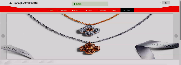 当用户打开系统的网址后,首先看到的就是首页界面。在这里,用户能够看到服装商城系统的导航条(首页、商城服装、服装资讯、公告栏、在线客服、购物车、个人中心)。系统首页界面如图5-2所示: