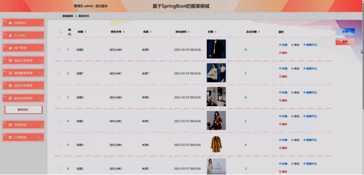 管理员点击商城服装管理,进入商城服装管理页面,通过输入商品编号可以查询的操作,还能对服装息进行新增、详情、修改、查看评论或删除等操作。具体操作如下图所示: