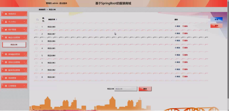 管理员点击商品分类管理,进入商品分类管理页面,可以通过输入商品分类进行查询的操作,还可以对商品分类信息进行新增、修改或删除等操作。具体操作页面如图5-10所示: