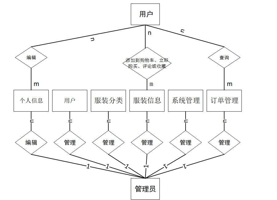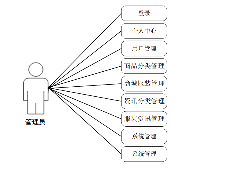 (2)、管理员的功能是最高的,可以对系统所有功能进行管理,包括对个人中心、用户管理、商品分类管理、商城服装管理、资讯分类管理、服装资讯管理、系统管理、订单管理的管理。管理员用例如下: