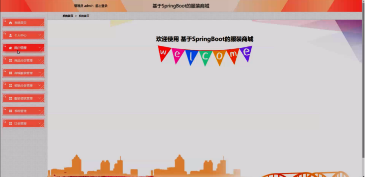 管理员进入主页面,主要包括对系统首页、个人中心、用户管理、商品分类管理、商城服装管理、资讯分类管理、服装资讯管理、系统管理、订单管理等进行操作。管理员主页面如图5-8所示: