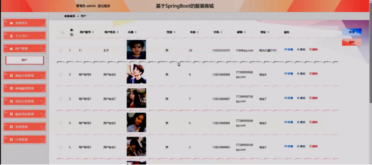 管理员功能:管理员可以对用户信息、商品分类、商品信息、资讯分类、资讯内容、系统设置、订单等进行管理。