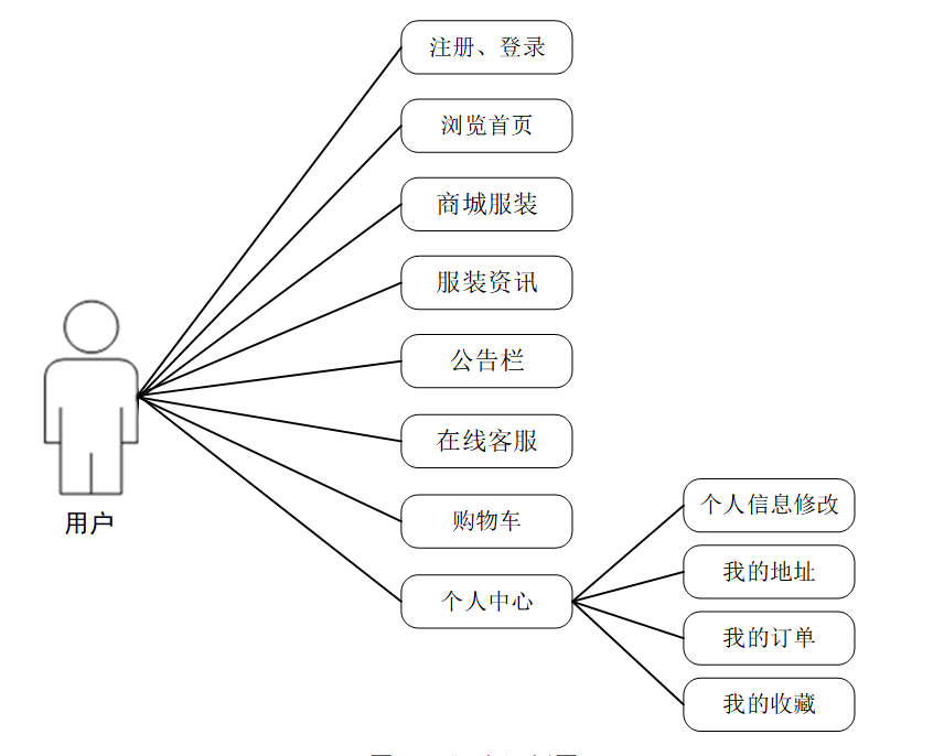 (1)、用户关键功能包含用户注册登录,查看商城服装、服装资讯、公告栏、在线客服、购物车、个人中心等有关信息,并进行详细操作。用户用例如下: