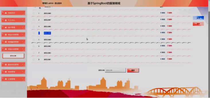 管理员点击资讯分类管理,进入资讯分类管理页面,输入资讯分类可以查询相关信息,并进行新增、修改、删除等操作;资讯分类管理界面如图5-12所示: