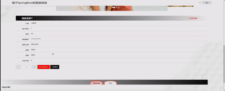 在商城服装页面的输入栏中输入商品名称、商品分类、品牌、价格进行查询,进入商城服装页面可以查看商品详细信息,并进行添加到购物车、立即购买、评论或收藏操作,具体操作页面如下图所示: