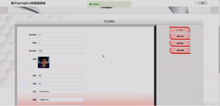 点击个人中心,用户在个人中心页面可以更新个人信息,还可以对我的订单、我的地址和我的收藏内容进行详细操作;具体操作页面如下图所示: