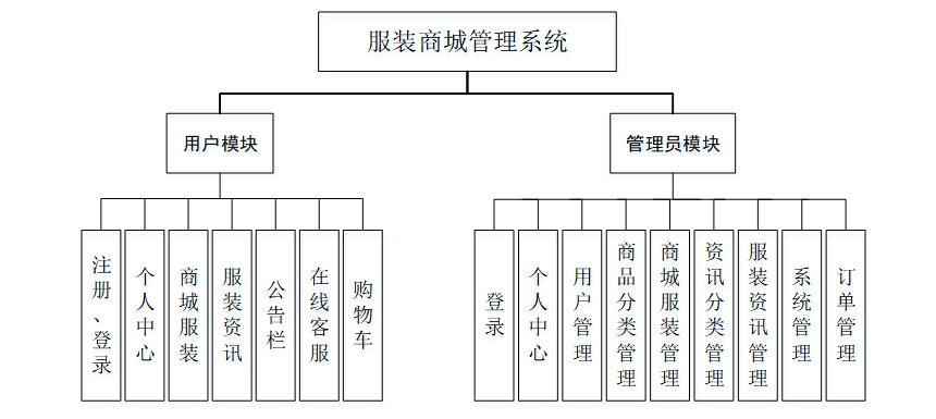 服装商城系统按照权限的类型进行划分,分为用户和管理员两个模块。用户模块主要实现个人信息修改、对服装信息、公告资讯、客服中心、购物车等信息进行操作,增强了用户的操作体验。管理员模块主要针对整个系统的管理进行设计,提高了管理的效率和标准。系统的总体模块设计如下图所示:
