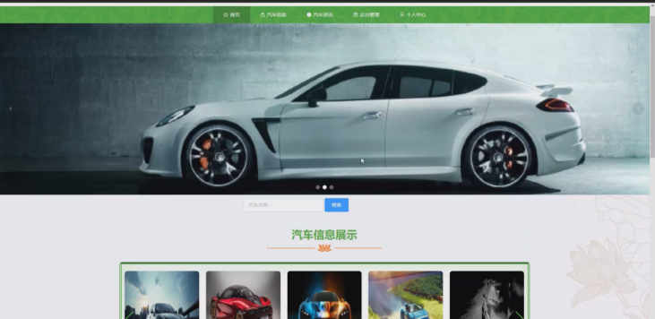 当人们打开系统的网址后,首先看到的就是首页界面。在这里,用户可以进行注册、登录,并浏览首页、汽车信息、汽车资讯、后台管理、个人中心进行管理;用户如果没有登录,对以上的功能只有查看的权限。系统首页界面如图5-1所示: