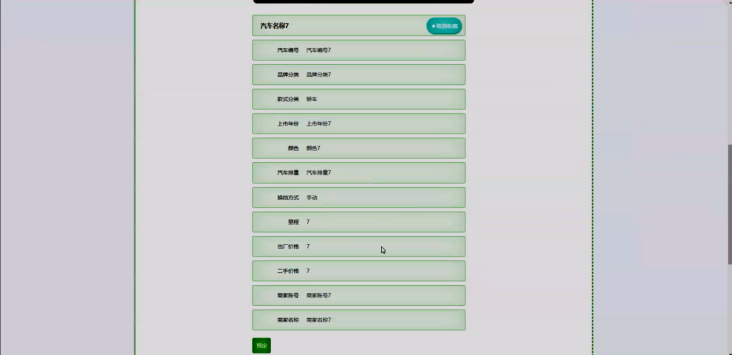 在汽车信息页面的输入栏中输入相关信息进行查询,进入汽车信息页面可以查看到汽车名称、品牌分类、款式分类、上市年份、颜色、汽车排量、出厂价格、二手价格、商家名称等详细信息,并进行收藏、预定等操作,汽车信息页面如下图所示: