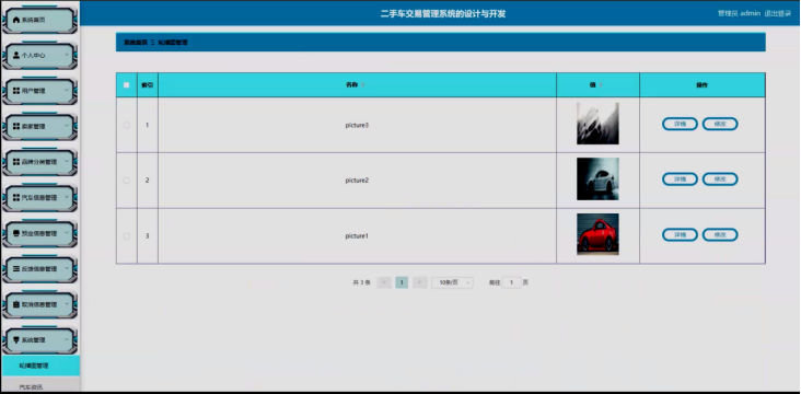 管理员点击系统管理,进入系统管理页面,可以对关轮播图管理、汽车资讯这两个子功能模块进行管理。系统管理页面如图5-15所示: