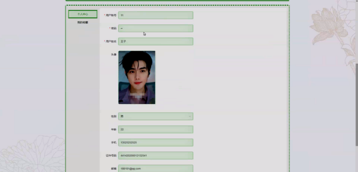 用户在个人中心页面可以更新个人详细信息,并可以根据需要对我的收藏内容进行详细操作;个人中心管理页面如图5-4所示: