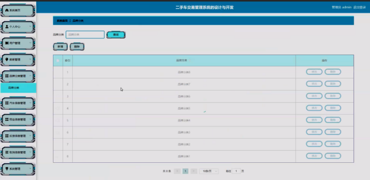 管理员点击品牌分类管理进入管理页面,可以通过输入相关信息进行查询,并进行新增、修改、删除等操作。如图5-10所示:
