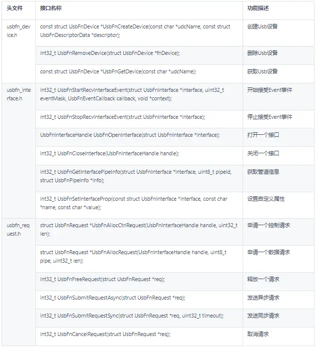 提供的部分接口说明如表2 USB Device DDK接口所示: