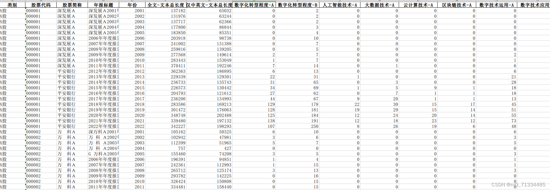 4、指标及具体词频:类别、股票代码、股票简称、年报标题、年份、全文-文本总长度、仅中英文-文本总长度、数字化转型程度-A、数字化转型程度-B、人工智能技术-A、大数据技术-A、云计算技术-A、区块链技术-A、数字技术运用-A、数字技术应用-B、互联网商业模式-B、智能制造-B、现代信息系统-B、人工智能、商业智能、图像理解、投资决策辅助系统、智能数据分析、智能机器人、机器学习、深度学习;