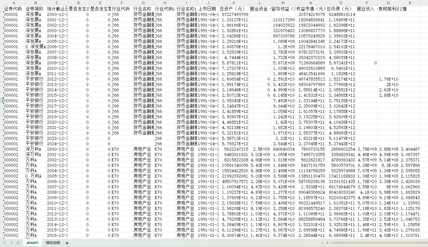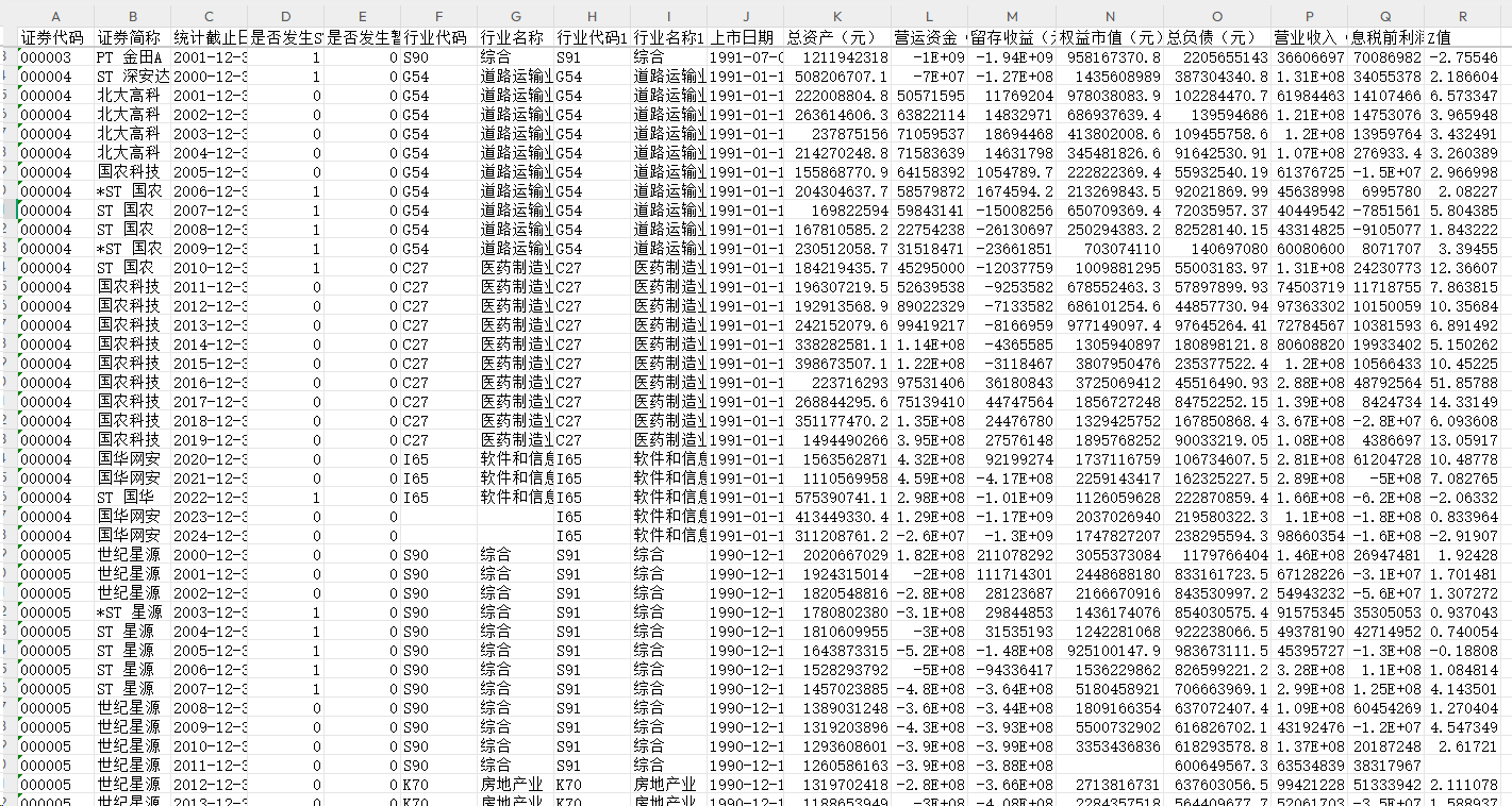 3、指标:证券代码、证券简称、统计截止日期、是否发生ST或*ST或PT、是否发生暂停上市、行业代码、行业名称、行业代码1、行业名称1、上市日期、总资产(元)、营运资金(元)、留存收益(元)、权益市值(元)、总负债(元)、营业收入(元)、息税前利润(元)、Z值