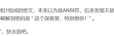 密文破译成功!《由0和1组成的密码,何解?》 一个多月前某平台一位粉丝给我留言,和自己聊的很熟的异性发来一段密文,说这是她想对粉丝说的话,于是该粉丝求助我帮忙破译:这是一个长1089个数的由0和1组成的密文,本来以为是ANSI符,后来发现不是,也不是十进制译成二进制。历时一个月,我破解到密码是 “ 这个深夜里,特别想你!粉丝老哥啊!你的爱情来了,快去追吧。后面说说我所如何破解的。走在学校的路上,我看到树上的一个活动宣传,有个二维码,然后我都灵感就来了:会不会是一个二维码,扫描得到信息呢,而恰好0可以代表二维码中的白色,而1表示黑色。