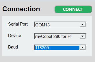 选择机械臂的型号,串口号还有波特率进行连接