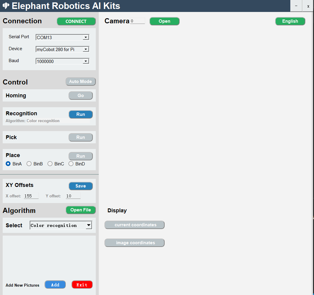连接机械臂->选择算法->开启相机->开启自动模式
