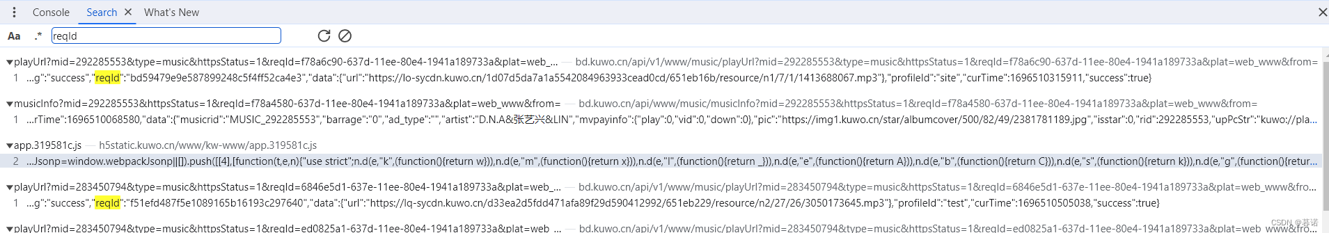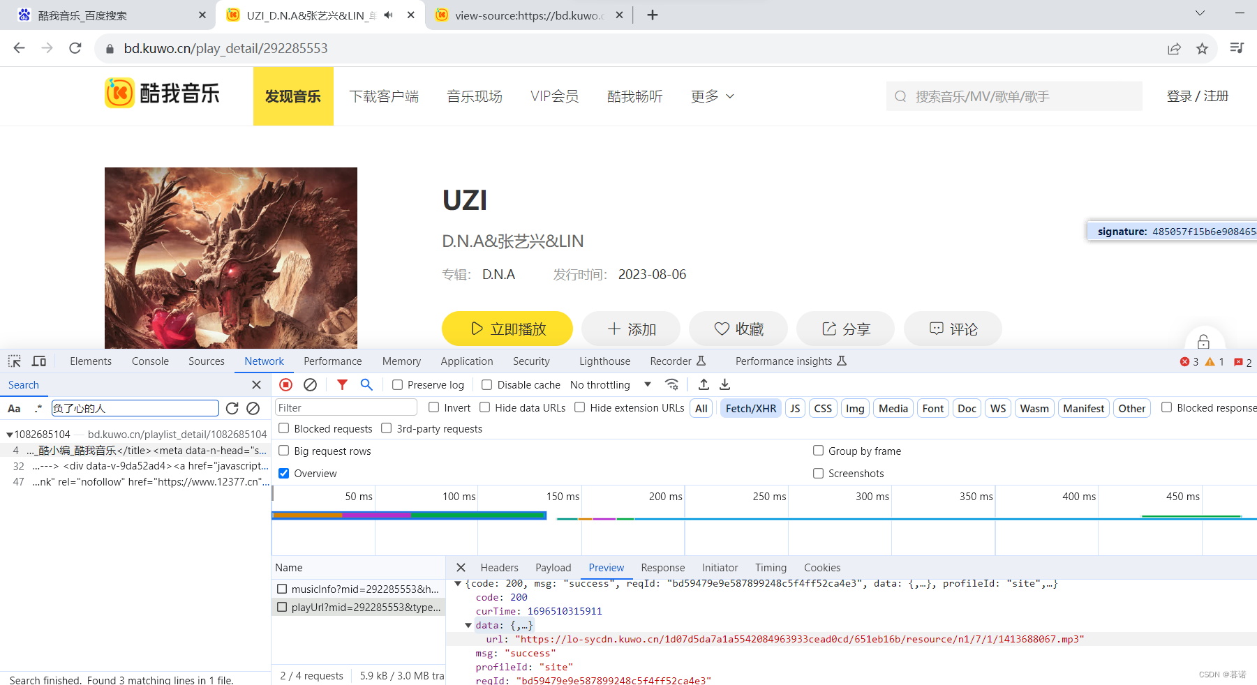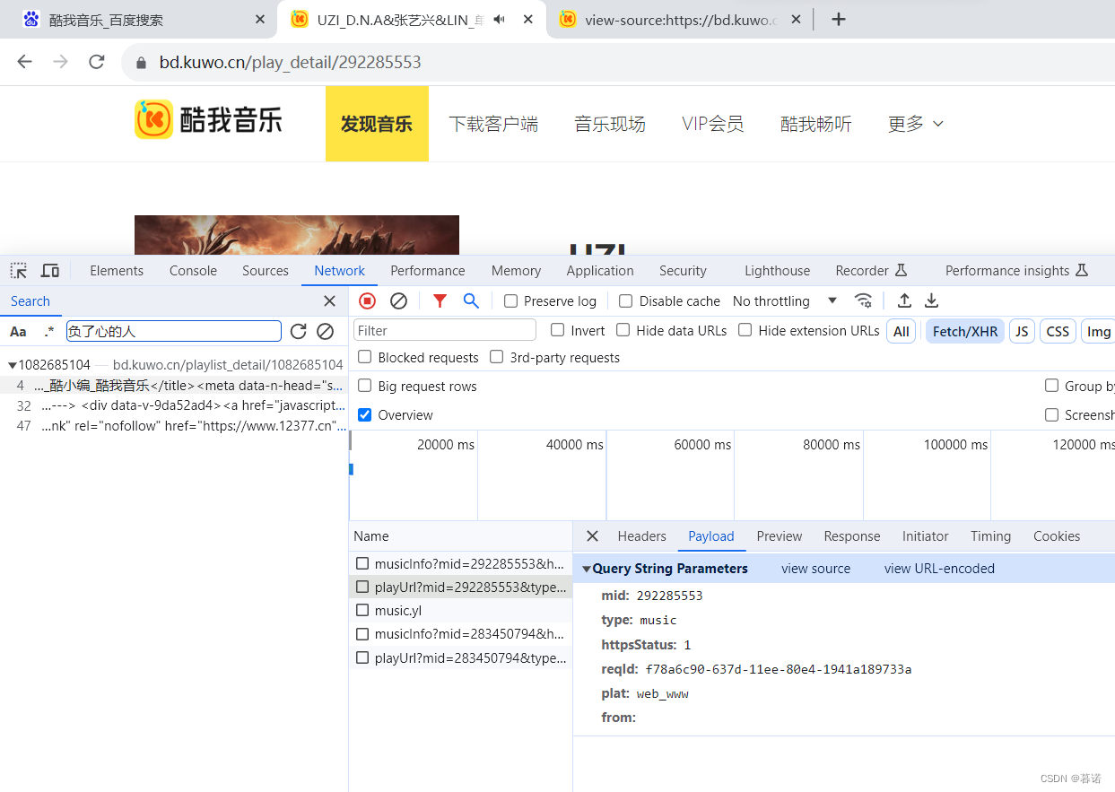 随便点了一首,把network清空,然后点击立即播放。发现了歌曲Mp3链接。可以多点几个,对比下payload.