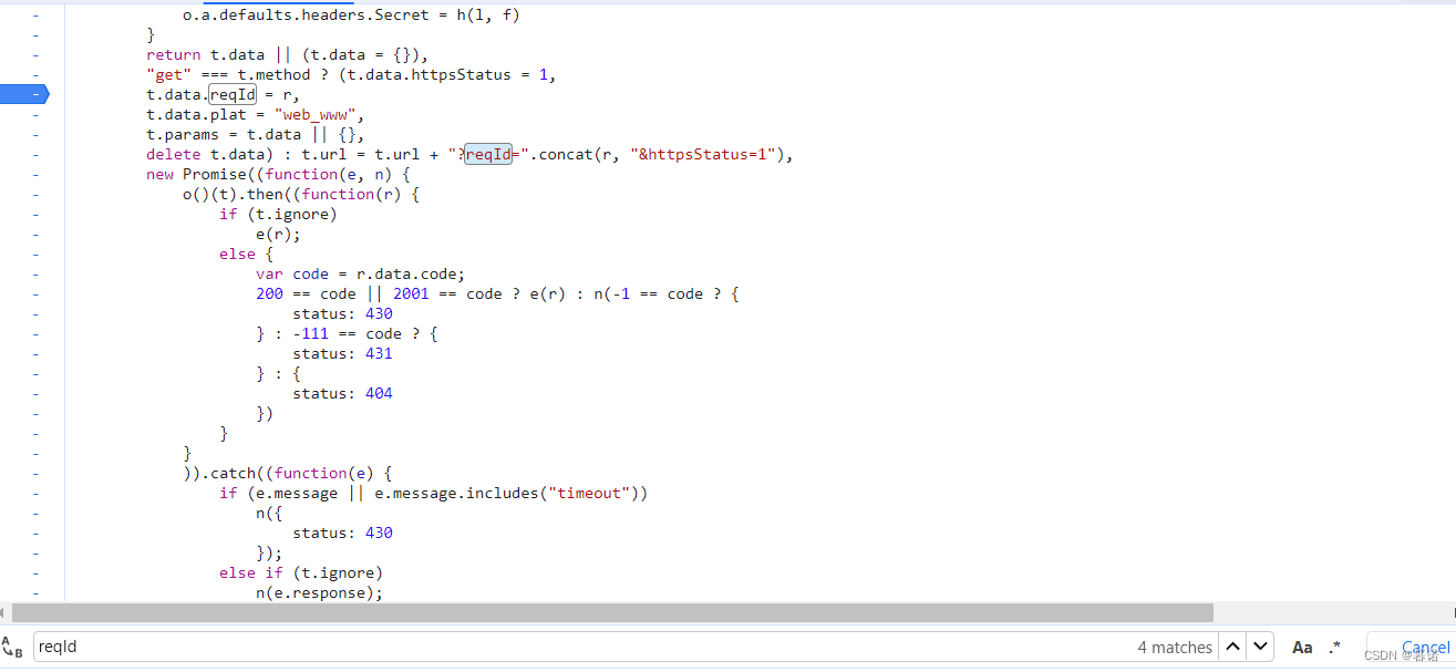 搜索reqId,找到第一个给上断点,然后刷新,发现没有暂停,说明不是这个,继续往下找