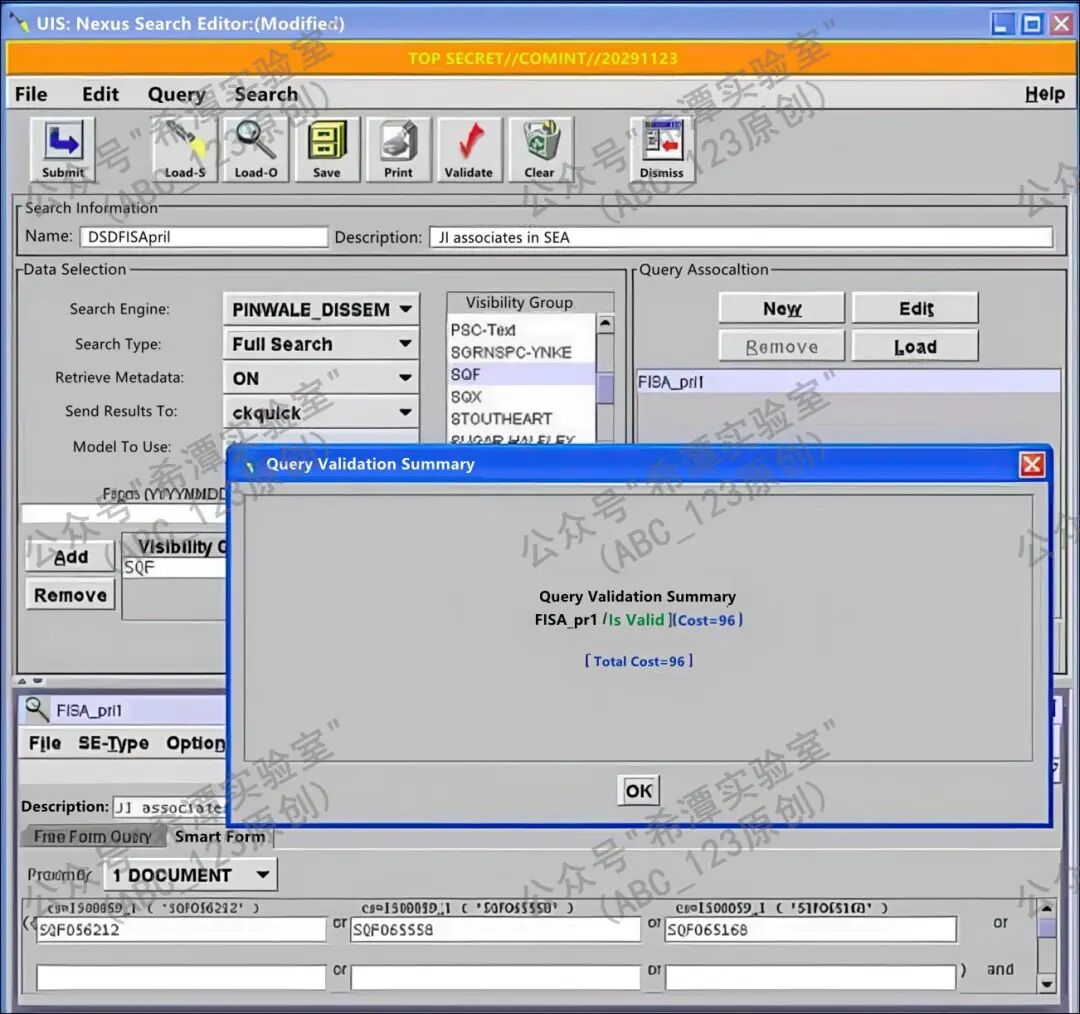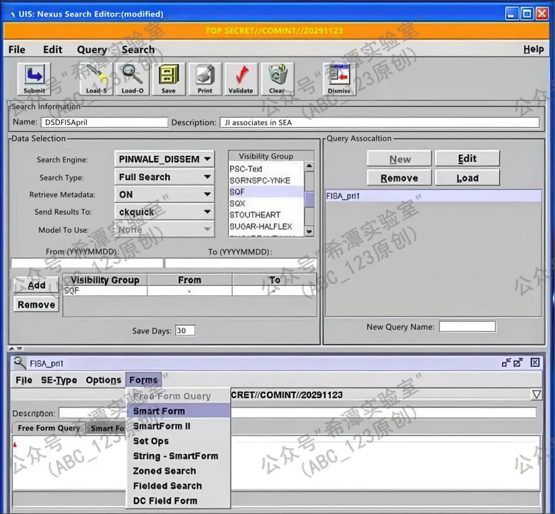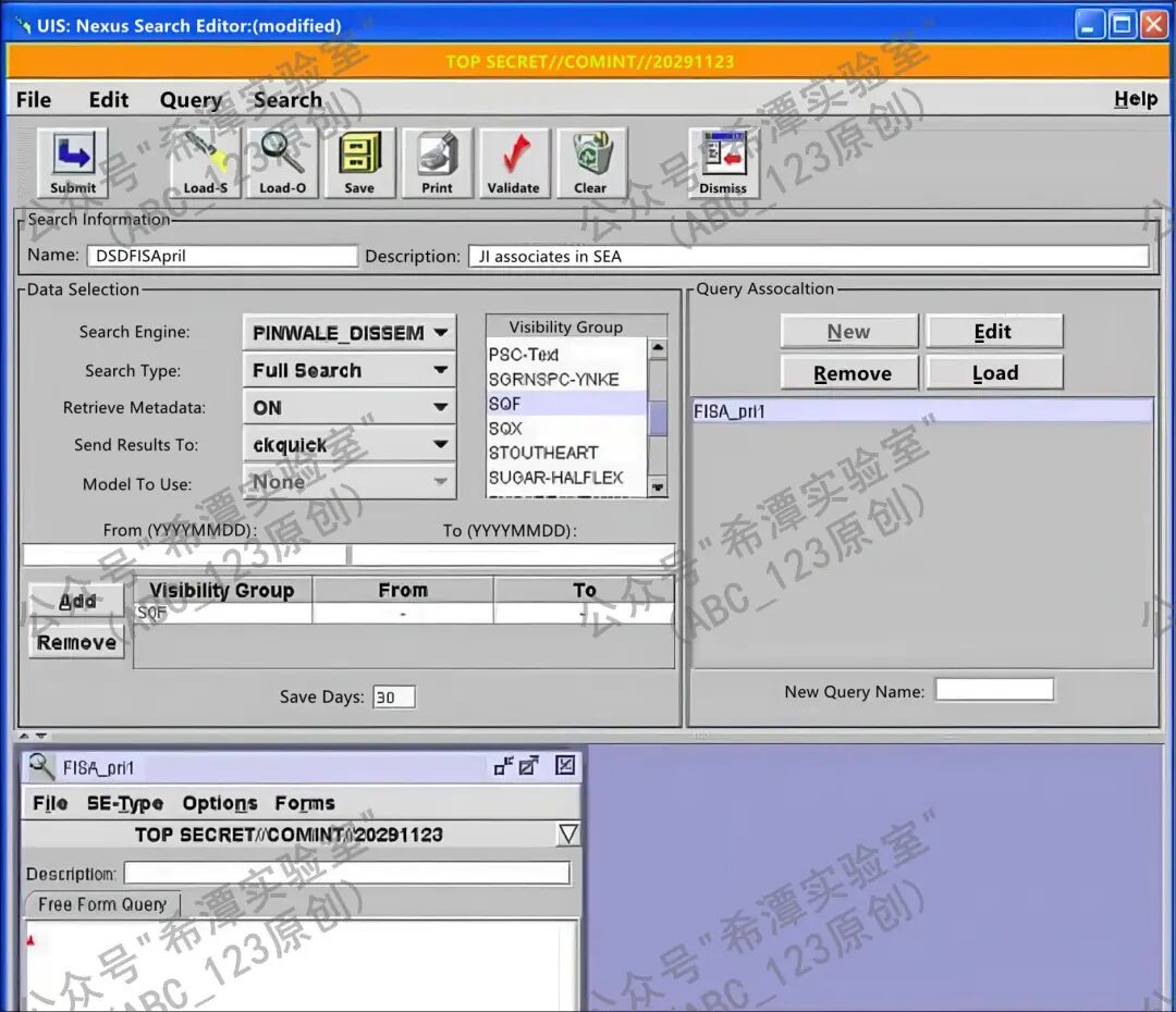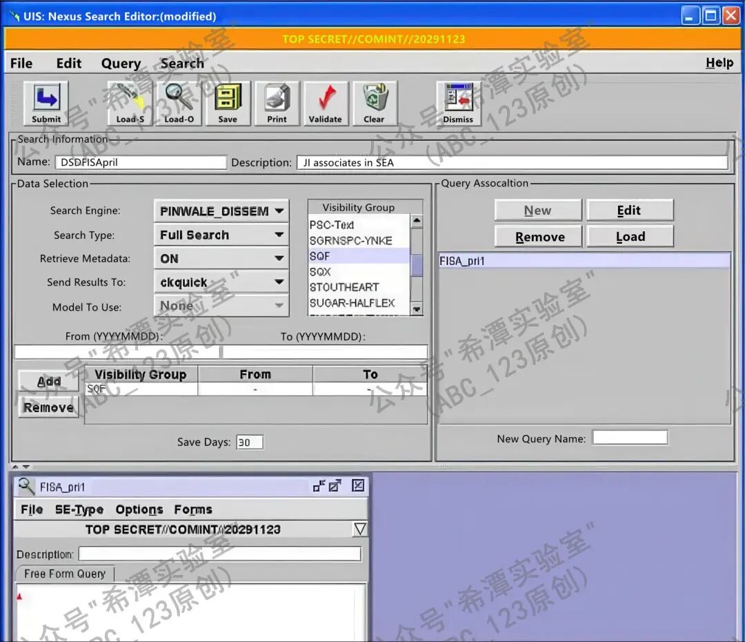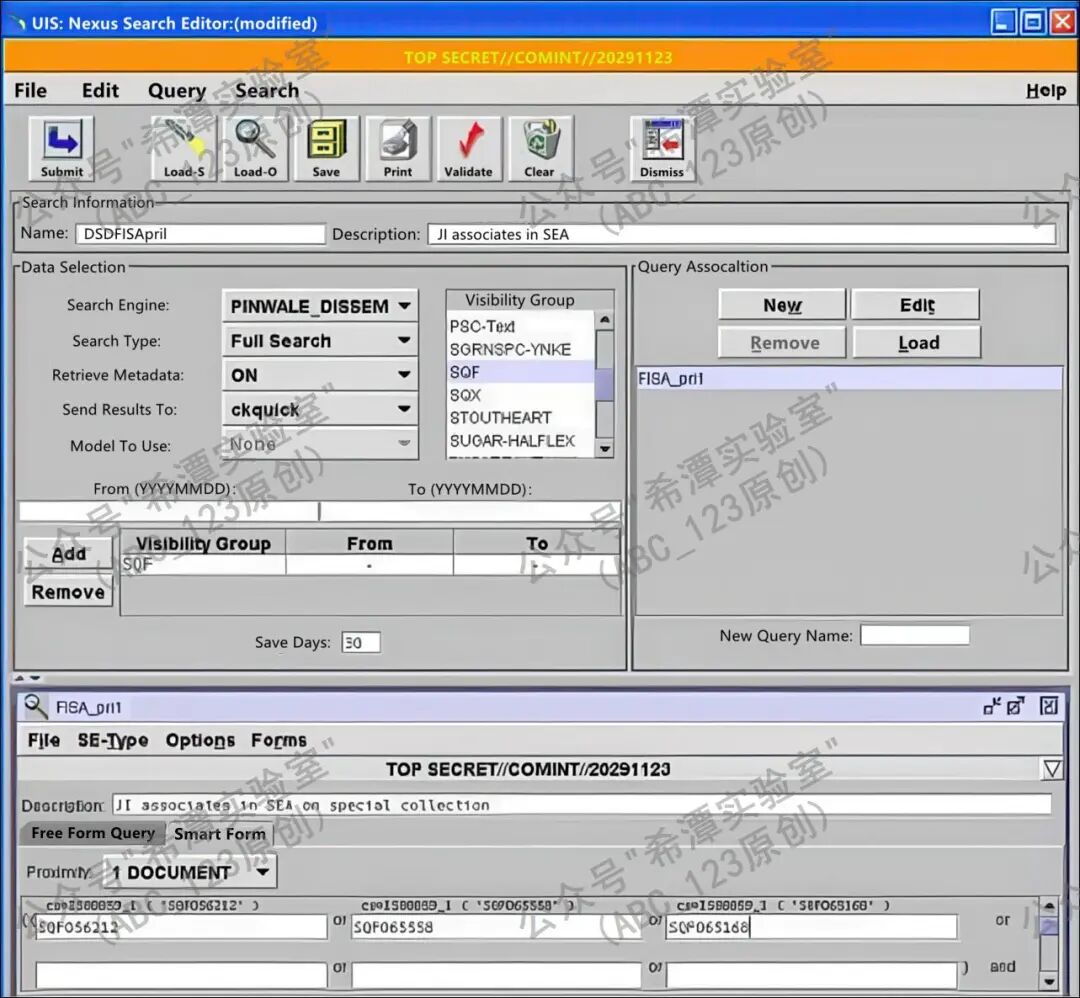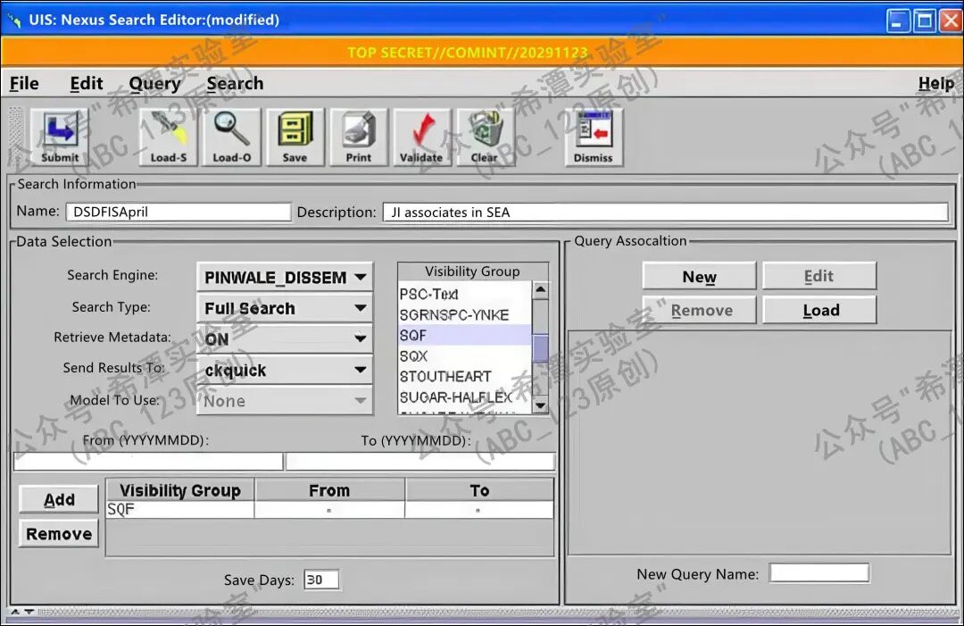 接着,可以使用区域中的四个核心功能按钮来操作查询:New按钮用于创建一个新的查询,并为其指定名称;Edit按钮则可以打开已选中的查询,或者在同时存在多个查询窗口时,将所选查询置于最前端以便编辑和查看;Remove按钮用来将某个查询从当前的关联列表中移除,但需要注意的是,这一操作不会将该查询从保存的文件夹中彻底删除,因此用户仍可在以后重新加载它;Load按钮则会打开“Load Query”对话框,允许用户将之前保存的查询载入进来,这些保存的查询既可以是个人保存的,也可以是团队或共享资源中的查询。与此同时,系统还支持配置Visibility Groups,用于设定查询的可见性范围和权限控制,确保不同用户在各自的权限范围内进行检索操作。工具界面中展示的FISA_pr1查询,就是一个保存并加载的实例,它不仅直观演示了查询的保存与调用过程,也体现了这些功能在日常使用中的重要性。