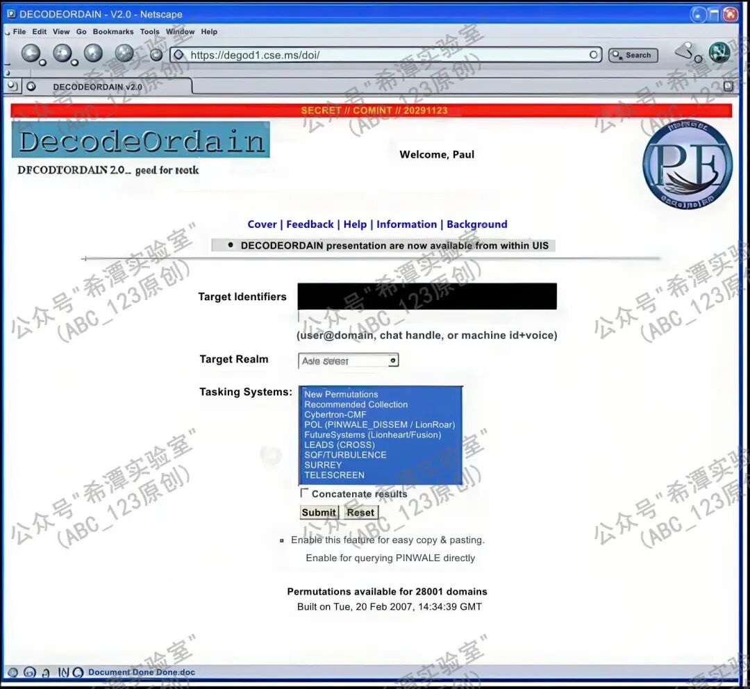 当情报收集人员需要查询电子邮件账户时,可以使用DECODEORDAIN工具。它会自动为用户生成各种查询组合,从而提高搜索效率,查看与目标账户相关的各种信息。查询的结果可以直接与PINWALE数据库链接,便于后续情报分析、证据关联与文档检索。