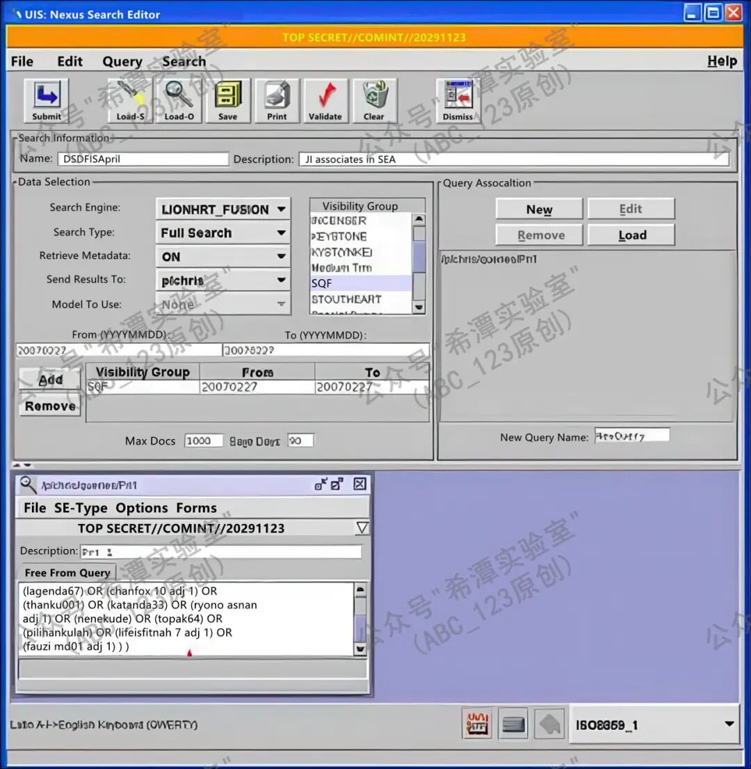 如下图所示,这是NEXUS Search Editor的功能界面,用于编辑和执行查询语句。NEXUS Search Editor 是一个查询编辑工具,用于创建和修改PINWALE及其他情报数据库中的搜索功能。该工具允许用户选择搜索引擎(如LIONHRT_FUSION),可以设置特定的查询类型(如全文搜索)。通过界面上的选项,用户可以控制元数据的检索、搜索结果的类型、结果的可视化组以及查询的时间范围等。