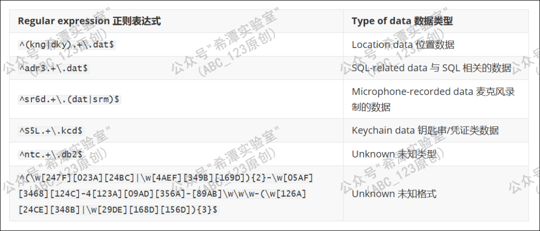 这些正则表达式匹配的文件名通常是TriangleDB后门各种窃听模块窃取的数据文件,这些窃听模块本身通常由攻击者通过 C2 下发的指令(例如 CRXUpdateRecord 与 CRXRunRecord)部署到被入侵的苹果终端。