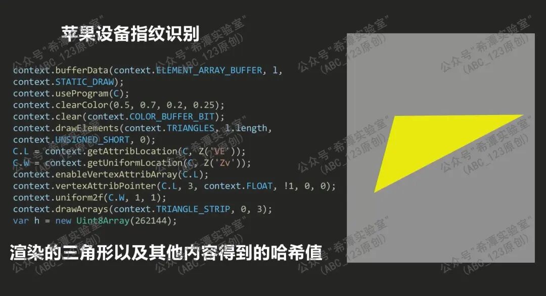 为了进一步识别设备,黑客使用了一种叫做Canvas 指纹识别的技术。通过苹果设备浏览器使用 WebGL 绘制一个“粉色背景 + 黄色三角形”,然后读取生成图片的像素数据,计算一个独特的校验码(checksum),这样,每台设备因为显卡、系统、驱动不同,都会生成略微不同的数值,美国APT就能用这个数值来唯一识别这台设备。报告里那段代码就是用来画这个三角形的。一旦JavaScript验证器后门运行完毕:它会把采集到的设备信息加密后上传到另一个唯一的服务器地址(也是 backuprabbit[.]com 域名下的);服务器收到这些数据后,会决定是否继续感染这台设备;如果通过验证,会继续植入二进制验证器后门,继续收集信息对目标苹果设备进行判断。