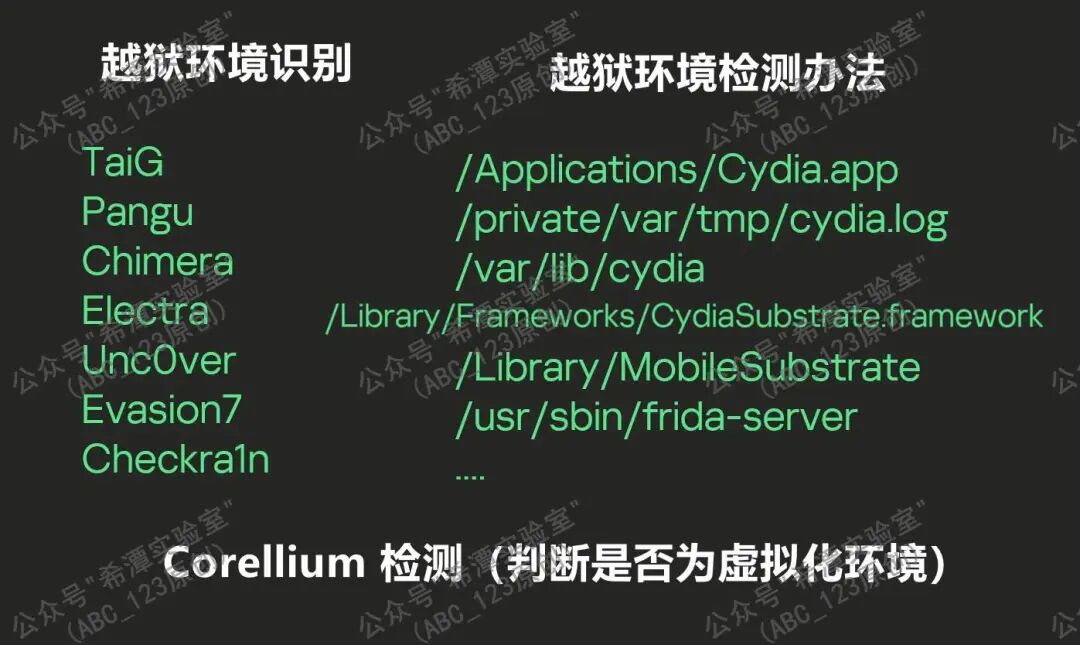 JailbreakDetect命令:检查目标设备是否已越狱。验证器实现了对大量越狱工具的检测,包括 盘古(Pangu)、xCon、Evasion7、Electra、unc0ver、checkra1n 等等。还可以检测经常运行在越狱设备上的软件,如Cydia、Frida。同时会检查是否运行在云端的iPhone平台Kerilium,该系统通常被用来做漏洞研究,那么三角测量后门的漏洞利用过程将自动失效。