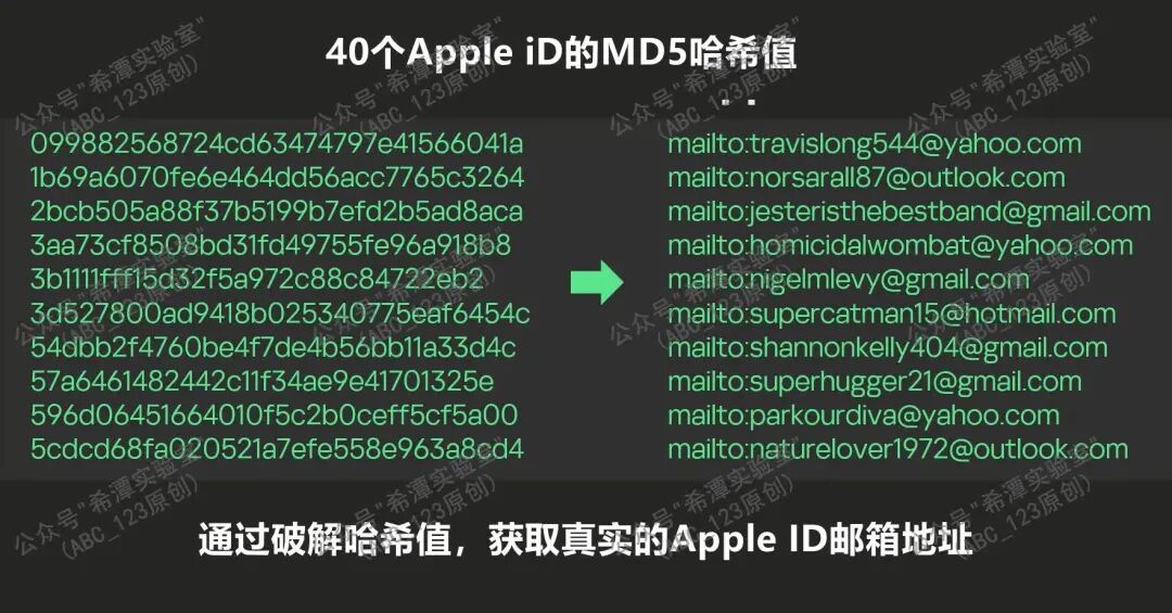 DeleteArtifacts命令:该命令旨在清除与恶意 iMessage 附件相关的本地使用痕迹。二进制验证器后门会在 iOS 的不同系统数据库(例如 ids-pub-id.db、knowledgeC.db 等)中检索与攻击活动相对应的记录并删除。验证器后门会尝试获取苹果手机中所有已接收的iMessage列表,并获取每一条消息的发件人的Apple ID,并计算器哈希与其配置中包含用于发送恶意 iMessage 的约 40 个 Apple ID 的 MD5 哈希值进行对比,如果匹配就进行删除,防止被取证分析。安全分析人员通过暴力破解哈希的方式获得了若干 Apple ID恶意邮箱地址,这些账户被攻击者用来以iMessage消息附件的形式,将恶意代码投递给受害者。