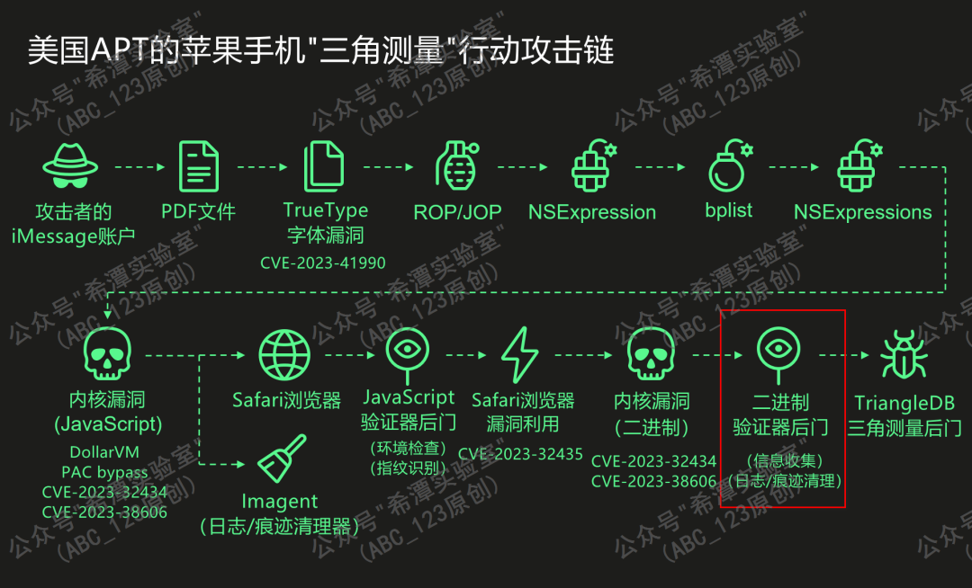 大家好,我是ABC_123。本篇文章继续讲解美国苹果手机"三角测量"攻击行动,该后门代码的兼容性暗示其使用了长达10年之久,今天我们重点讲解该行动在验证器后门阶段和三角测量后门TriangleDB阶段展现出的隐蔽手法,为大家的安全运营防护提供实用借鉴(文末有技术交流群的加群方式)。