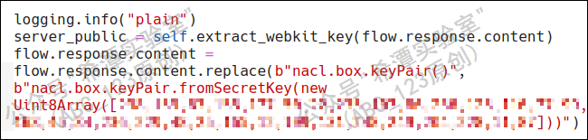 接下来编写一个mitmproxy 插件,用于监控 nacl.box.keyPair() 方法的调用,同时,将其替换为另一个方法 nacl.box.keyPair.fromSecretKey(),该方法通过提供的我们定义好的私钥去初始化密钥对。如下图所示,将一个私钥硬编码到了该方法的参数中。这样一旦带有后门的验证器在被感染的设备上执行,就可以解密 JS 验证器的所有通信