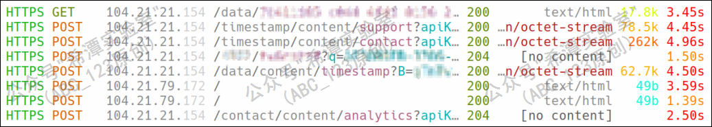 虽然没有iMessage的流量,mitmproxy 日志中仍然有抓到一部分有价值的通信;当三角测量攻击再次开始的时候,它成功解密了 C2 服务器的一部分通信流量。如下图所示,非常遗憾,这些流量中并没有针对 iOS 的漏洞利用代码。然而经过分析发现,它是 JavaScript 验证器后门 ,它的作用是收集受害者iPhone浏览器的信息并发送到 C2 服务器。第1条GET请求的url,推测就是加载JavaScript验证器后门代码,POST请求就是将收集到的受害者的信息发送给服务器。