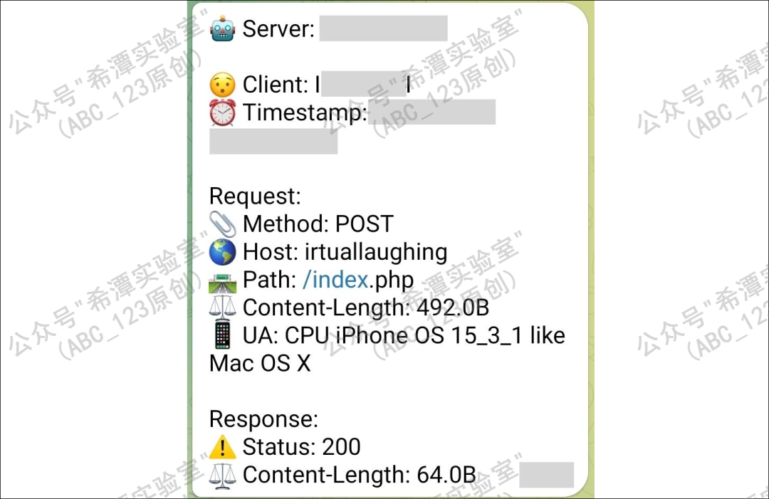 4. 为了能够第一时间发现被感染的痕迹,开发了一个 Telegram 机器人,只要被监控的iPhone、iPad设备被感染,就会收到消息: