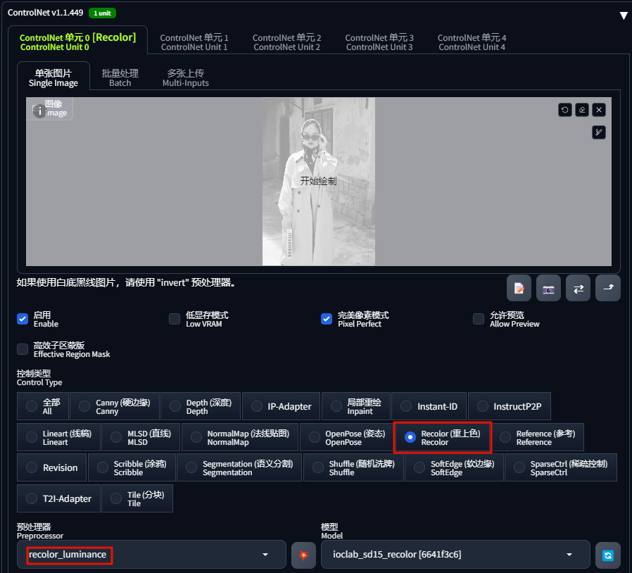 切换预处理器为「recolor_intensity(重上色-调节“图像强度”以去色)」,重新上色,生成图片如下: