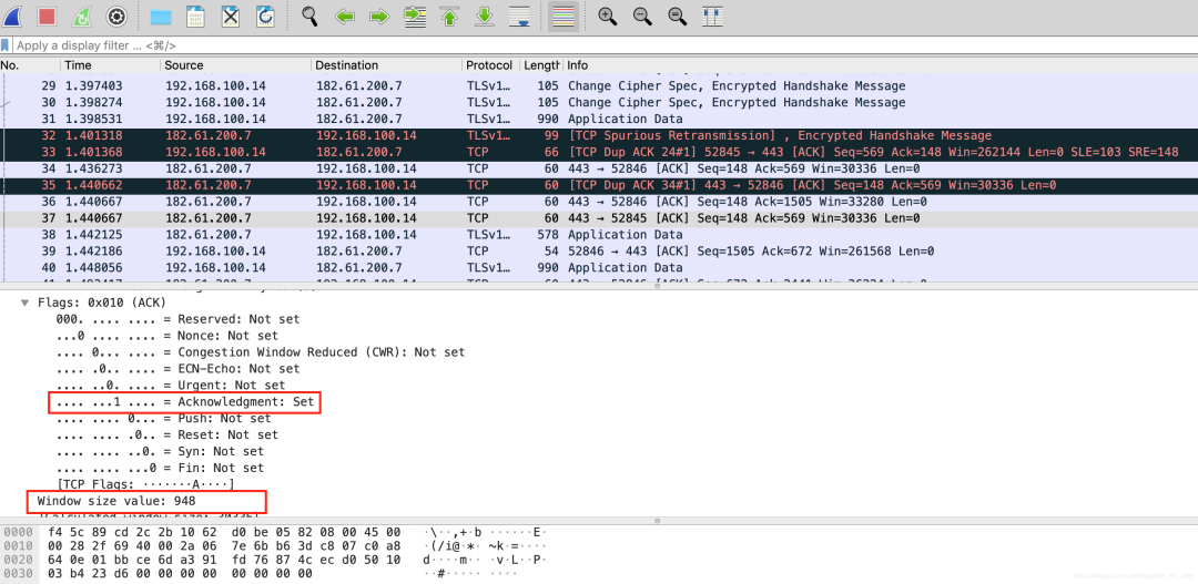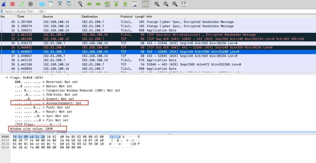 这里使用wireshark抓取baidu.com的TCP报文。可以看到,No.36是本机对服务器之前发送数据(No.31)的一个ACK确认(ACK的Flag标记成1),同时声明窗口大小(window size)为1040。