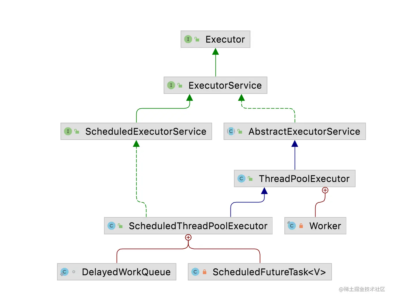 ScheduledThreadPoolExecutor的类结构图如上图所示,很明显它是在我们的线程池ThreadPoolExecutor框架基础上扩展的。