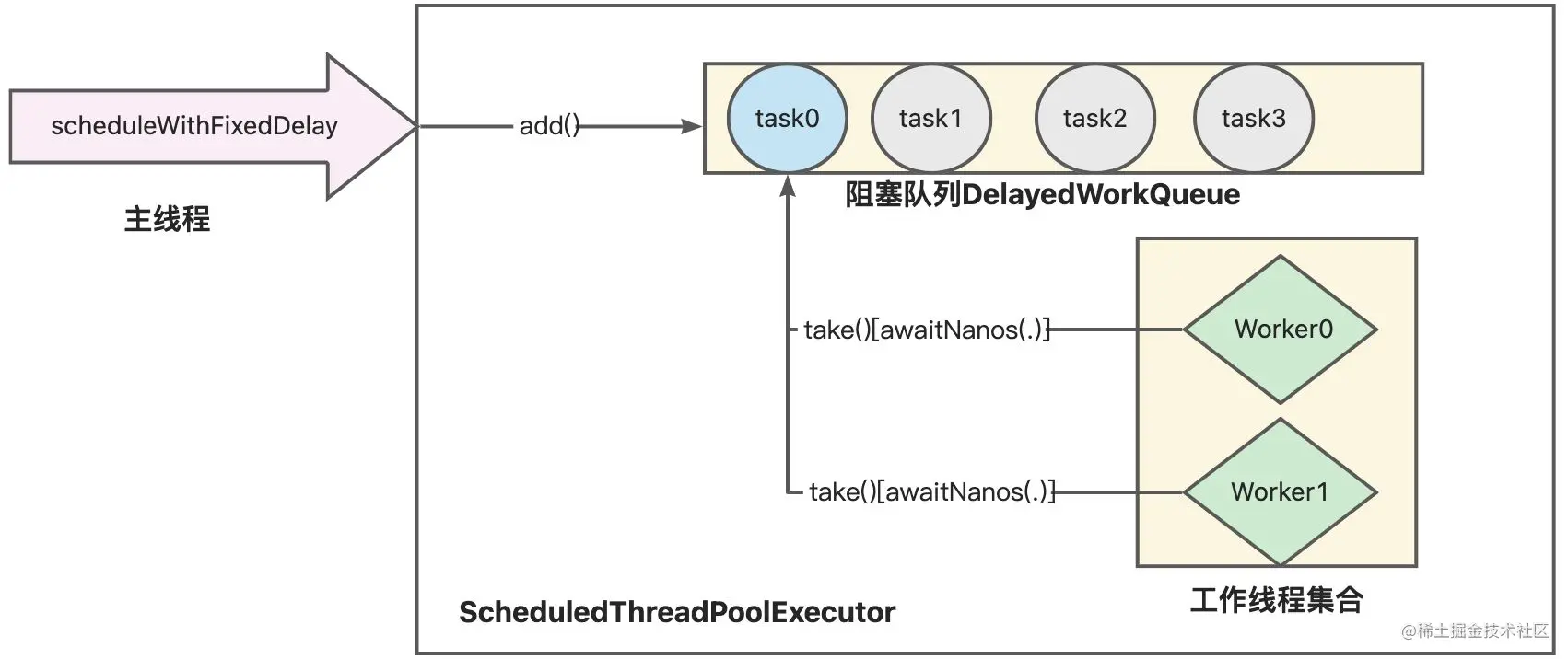答: 我们可以根据参数获取这个任务还要多少时间执行,那么我们是不是可以从阻塞队列中获取任务的时候,通过条件队列的的awaitNanos(delay)方法,阻塞一定时间。